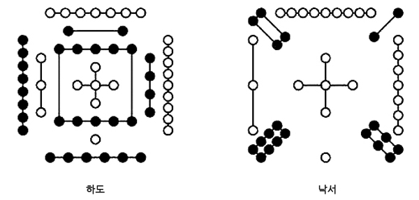 Hado. 하도 (河圖). “Yellow River Diagram.” Hetu in Chinese. A diagram representing the universe’s creative process, it was first drawn 5,500 years ago by Bok-hui (aka Fuxi) of the Baedal nation, after he received an inspiration from Sangjenim. Encapsulating the principles of yin-yang and the five elements, the diagram depicts the numbers one to ten with the even (yin) numbers represented by black dots and the odd (yang) numbers represented by white dots. Hado represents: the birth of heaven, earth, and humanity; unification and harmony; and the mutual life-bettering and life-saving of the Later Heaven. It has been said that the diagram was actually discovered at the Heavenly River aka the Songhua River, not the Yellow River.